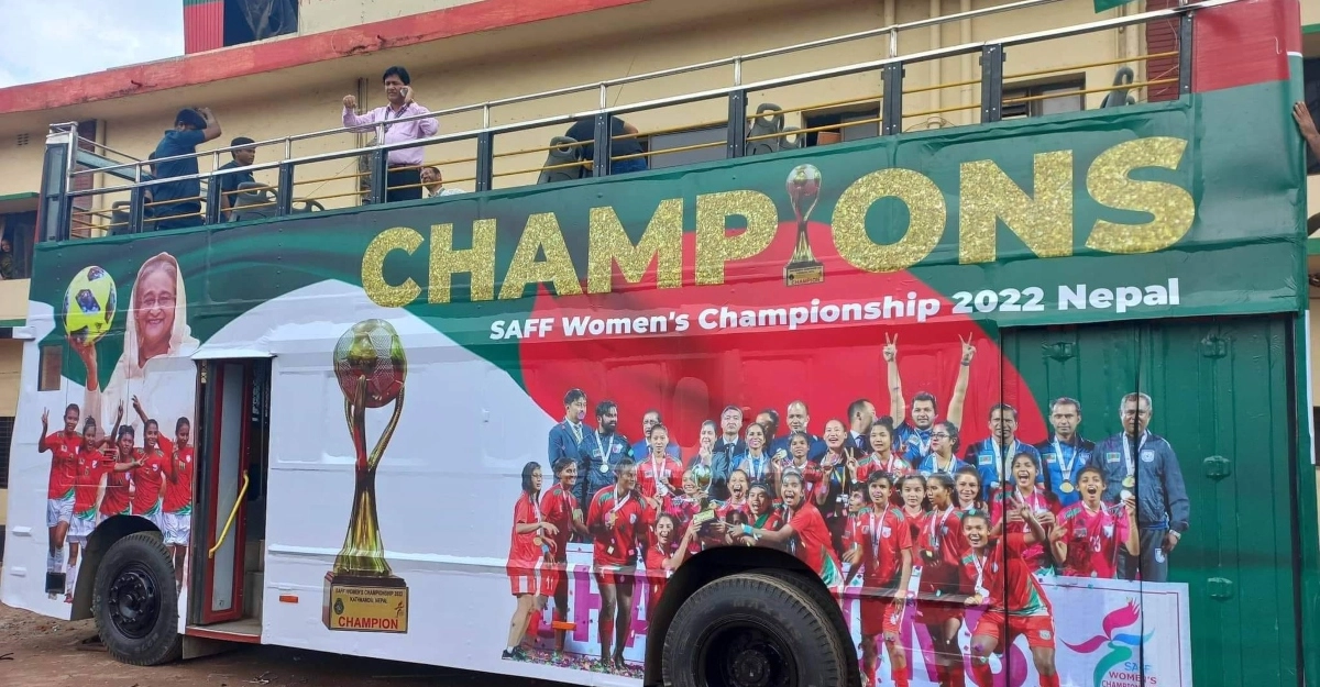 পুরো বাসে সাফ জয়ী ট্রফি ছাড়াও দলের ছবি মোড়ানো রয়েছে। থাকছে সাউন্ড সিস্টেম। বাজবে বিজয়ের গান। ছাদ খোলা বাসে চড়ে খেলোয়াড়রা পৌঁছাবেন বাফুফে ভবনে।